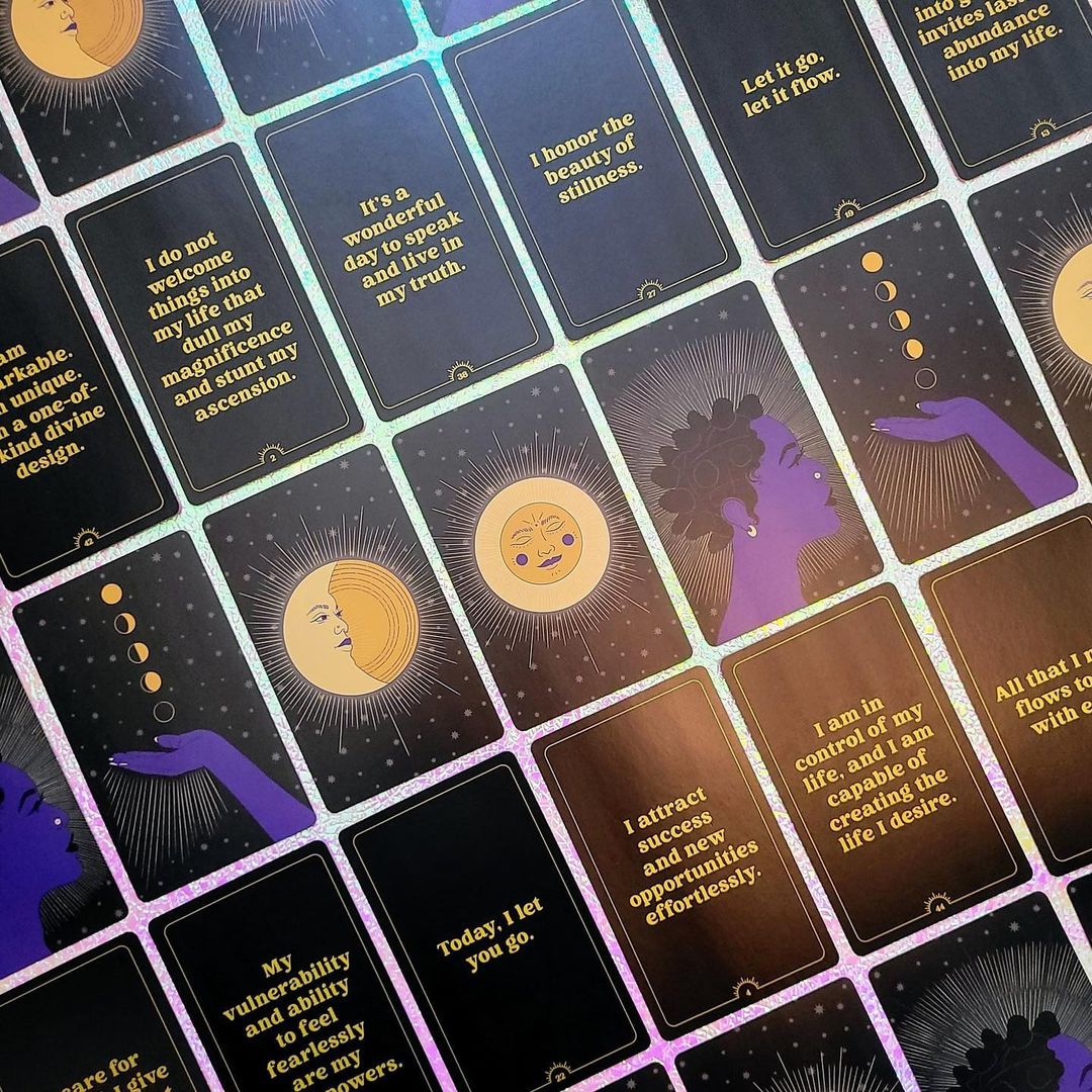 - Illustrated affirmation cards. 52 illustrated mantra cards, enhanced with gold metallic ink.
